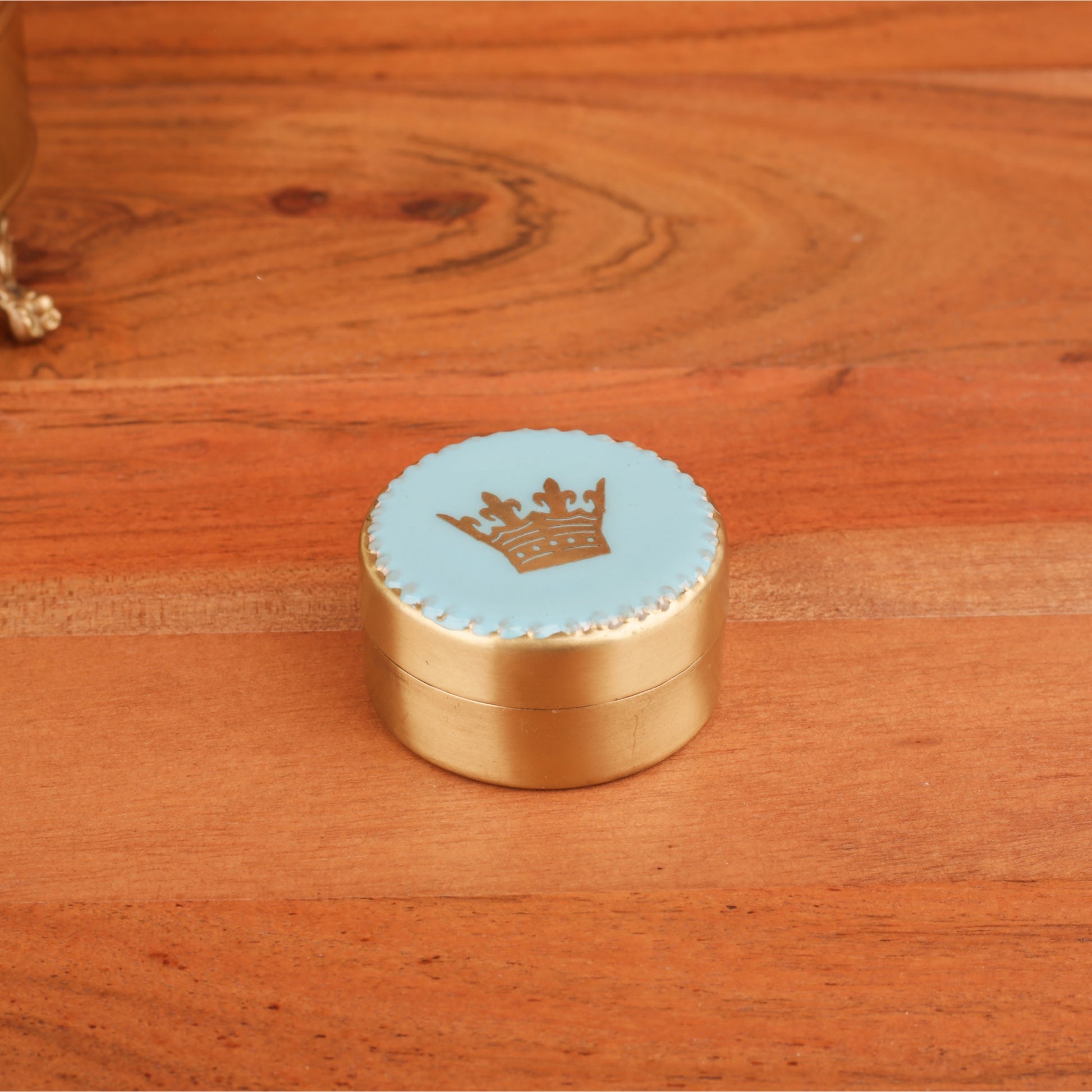 Store small treasures in style with the Brass Mini Round Box with Crown Printed. Featuring a luxurious brass finish and a crown print on the lid, this compact round box is perfect for rings, earrings, or tiny keepsakes. Elegant and decorative, it complements modern, vintage, and classic interiors, making it a stylish addition to your dresser, shelf, or a thoughtful gift for loved ones.